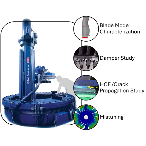 Dynamic Spin Rig ™ (DSR) Designed to test balded disks with the effect of centrifugal load. The DSR is used for studying blade dynamics, damping, mistuning effects and high-cycle fatigue (HCF). To avoid failures during engine test stand or flight testing, spin testing of new parts and components must begin early in a jet engine development program. We offer the next generation of spin testing equipment. Our exclusive Dynamic Spin Rig™ more closely duplicates the reality of an operating jet engine. Advanced mechanical, thermal, material utilization, and vibration stress tests can be performed with one machine that more fully accounts for conditions experienced by the real-world component. As a result, test data is much more robust and relevant than can be achieved using conventional spin test equipment.